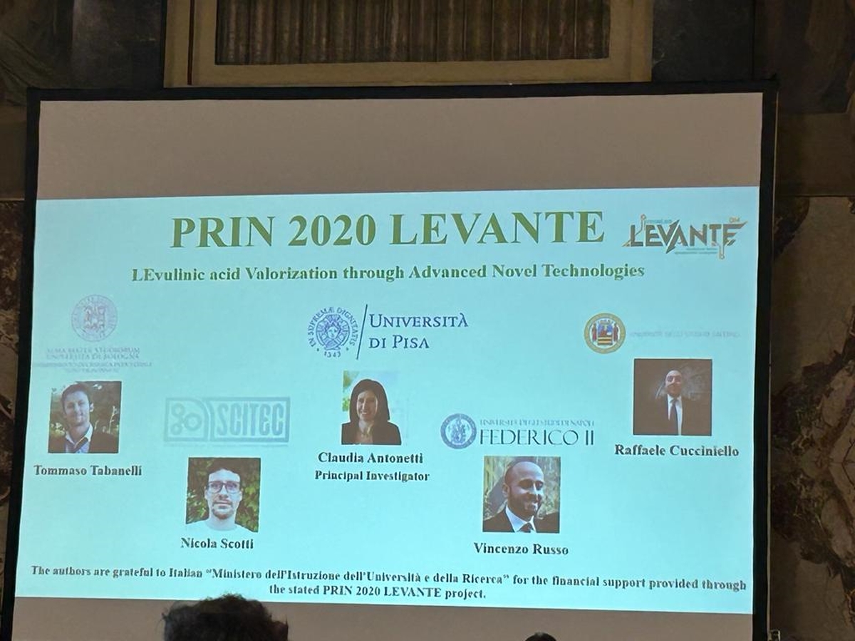 During 3-6 September 2023, the results of LEVANTE project were showed at the 6th EuChemS Conference on Green and Sustainable Chemistry www.6eugsc.org in Salerno, important event supported by the LEVANTE project. In particular, the Principal Investigator Claudia Antonetti (UNIPI) delivered the oral presentation “Biomass-derived acid catalysts for the sustainable production of diphenolic acid”, underlining the promising production of diphenolic acid in the presence of catalysts derived from biomass. The research units in Bologna and in Milano presented their accomplished results in the oral presentation “Catalytic transfer hydrogenation of levulinate esters with ethanol over Zr-based catalysts under continuous flow conditions” towards the production of γ-valerolactone in the presence of new catalytic systems. Meanwhile, the research unit in Milano showed the study on the catalytic trasnsfer hydrogenation of levulinic acid and levulinic ester in batch reactor with the poster presentation “Zirconia materials for (bio)alcoholic dreams: catalytic tools for lognocellulose valorisation”. Finally, the research unit of Salerno shows the validity of LCA analysis in the oral presentation “Maleic anhydride production from renewables: a life cycle assessment at pilot scale”.