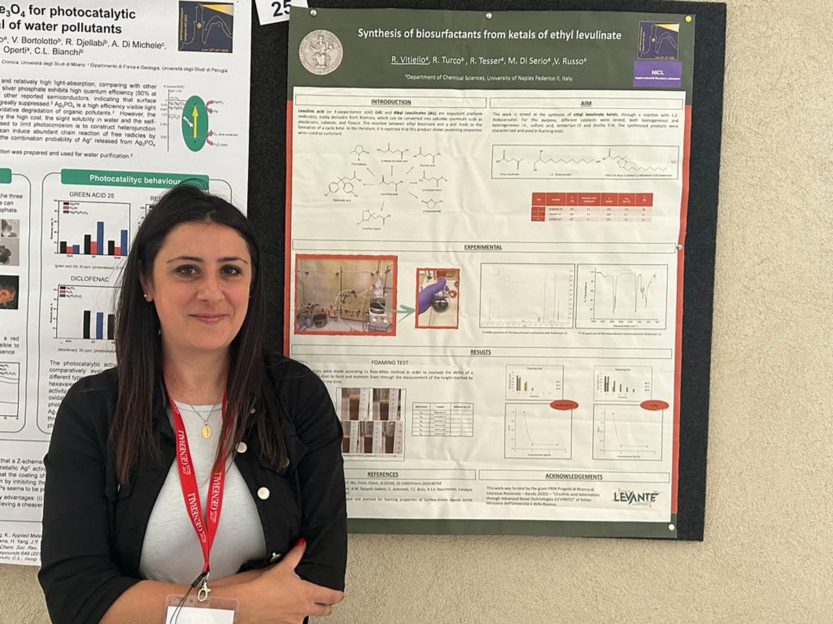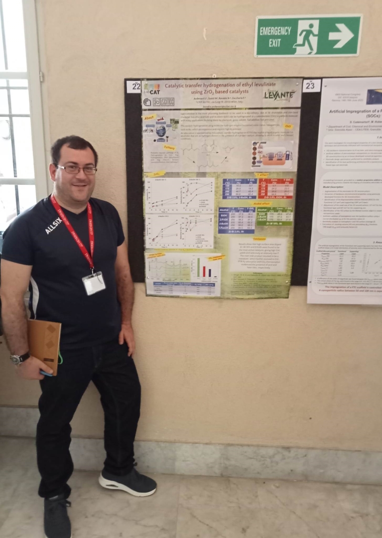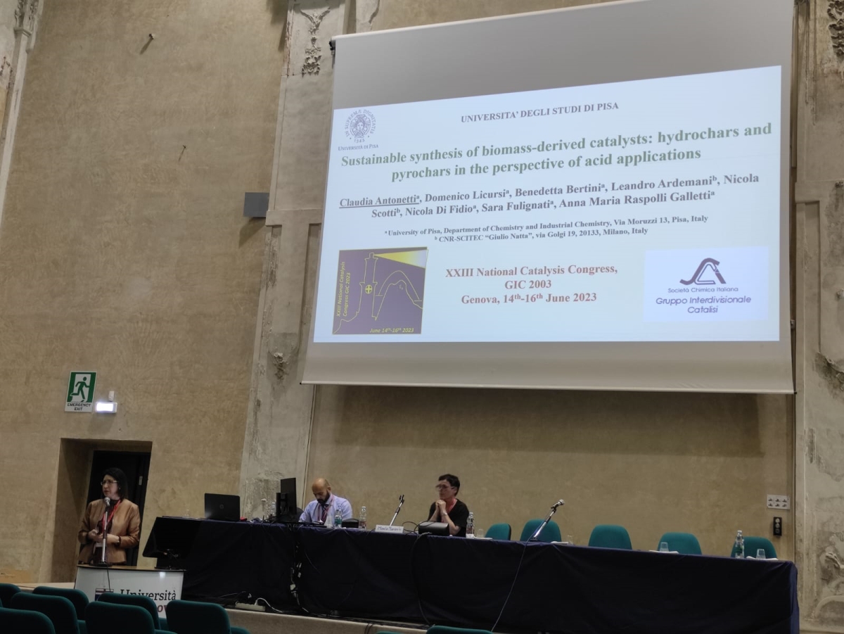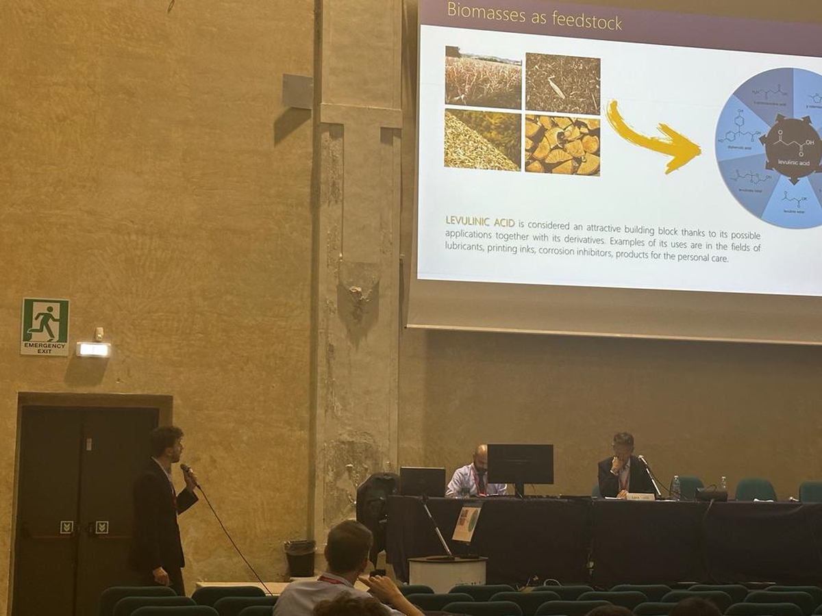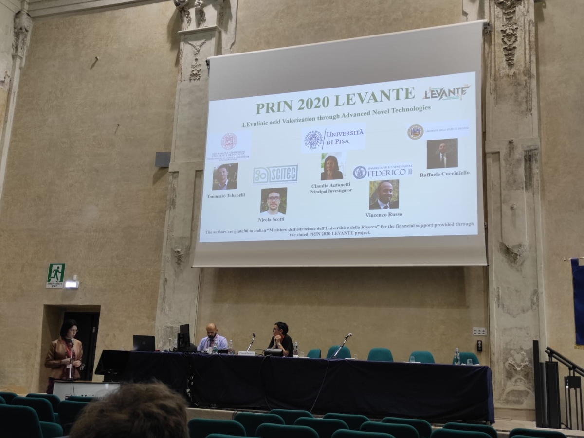 In 2023, the results of LEVANTE project were showed at the GIC 2023 conference, where the research units presented their findings both orally and as posters. Specifically, the Principal Investigator Claudia Antonetti (UNIPI) delivered the oral presentation “Sustainable synthesis of biomass-derived catalysts: hydrochars and pyrochars in the perspective of acid applications”, highlighting the achievements in the synthesis of acid catalysts derived from biomass. The research unit in Napoli presented their accomplished results in the oral presentation “Catalytic screening and kinetic investigation for DPA synthesis” about the production of diphenolic acid with commercial catalysts, and in the posters about “Heterogeneous catalysts for the ketalization of ethyl levulinate with glycerol”, “Synthesis of methyl-levulinate catalyzed by an ion-exchange resin: a kinetic investigation” and “Synthesis of biosurfactants from ketals of ethyl levulinate”. Meanwhile, the research unit in Bologna shows the study on the synthesis of C5 and C7 esters from levulinic acid and levulinic esters through continuous processes in the gas phase with the oral presentation “Beyond -valerolactone: from levulinic esters to C5 and C7 esters through innovative continuous-flow processes in the gas phase”. Finally, CNR-SCITEC.MI shows the results about the hydrocyclization of levulinic esters to γ-valerolactone with the poster “Hydrocyclization of levulinic esters to γ-valerolactone using ZrO2-based catalysts via catalytic transfer hydrogenation”.